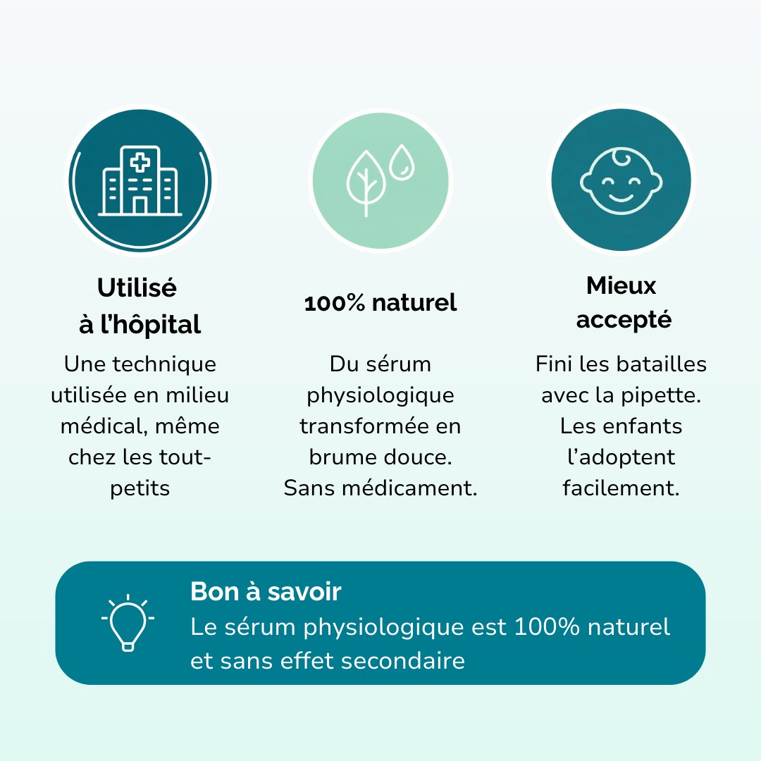 Le nébuliseur diffuse simplement de l’eau physiologique : une solution stérile, sans médicament et sans danger, composée d’eau et de sel adaptés au corps du bébé.