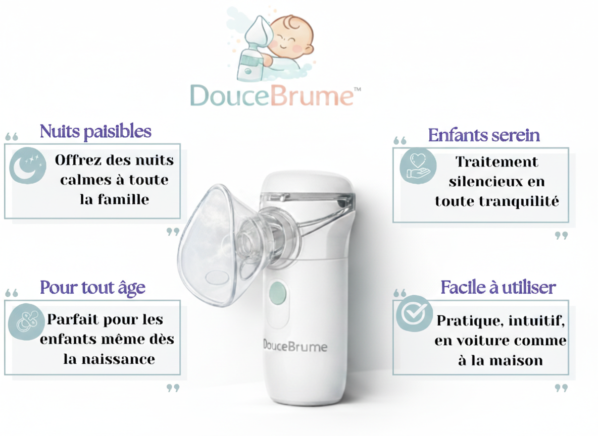 Selon Ameli.fr, l’aérosolthérapie par nébuliseur fait partie des solutions utilisées pour soulager les troubles respiratoires chez le nourrisson et l’enfant, notamment en cas de toux ou de gêne respiratoire.